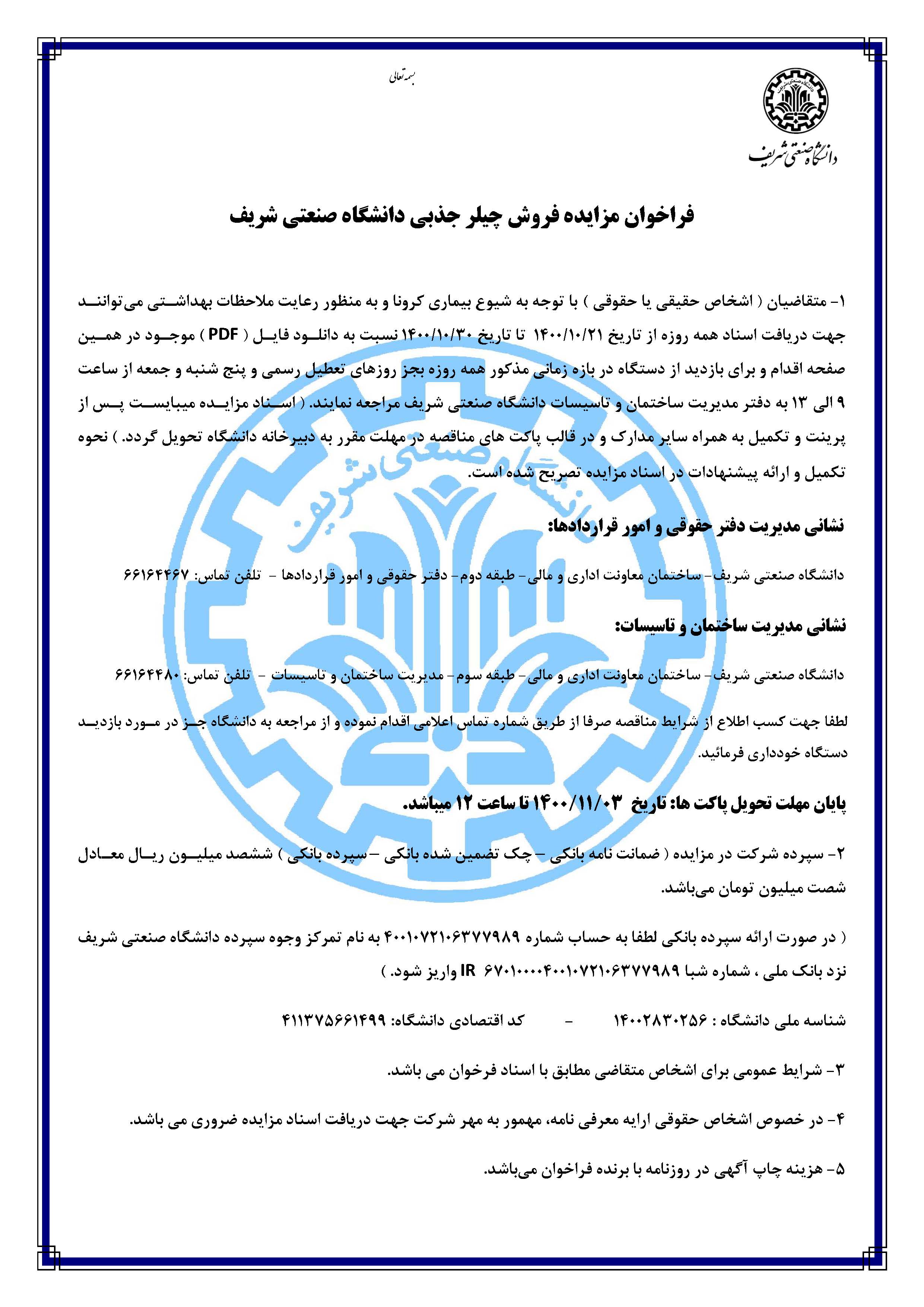 فراخوان مزایده فروش چیلر جذبی دانشگاه صنعتی شریف